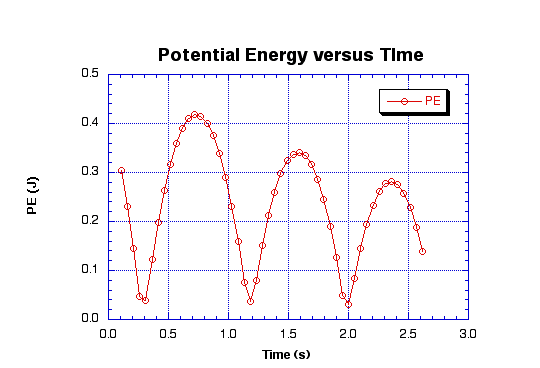 Potential energy is the possible amount of energy an object has before any movement. Potential energy is dependent upon the mass of the object, acceleration due to gravity and the height of the object. Each time the object falls it loses potential energy and each time it returns it gains potential energy. At t= 0.3, 1.2 and 2.0 s the ball hits the ground. This is because potential energy is lowest when the ball hits the ground.