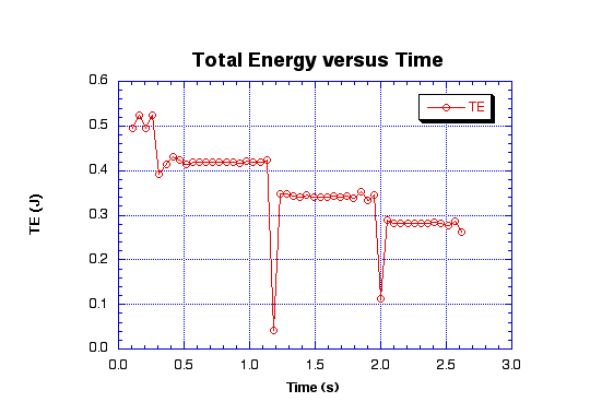 The total energy is the sum of both the kinetic and potential energy. At t=0.3, 1.2, and 2.0 s the ball is striking the ground. We know this because at these times the ball has its lowest amount of energy. This is a step-like function because when the kinetic energy is at its peak, potential energy is at its valley, and vice versa. This creates horizontal lines when they are added.