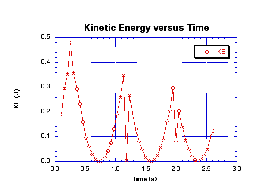 Kinetic energy is the energy an object has while in motion. An object loses kinetic energy each time it hits a non-elastic surface. Kinetic energy is dependent upon the mass of the object and the velocity the object is moving with. The sharp decreases at t= 1.2 and 2.0 s are where the ball hit the ground.