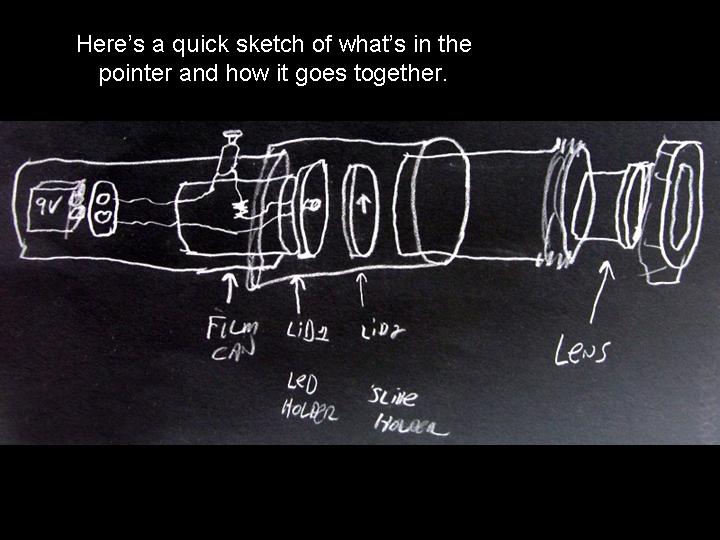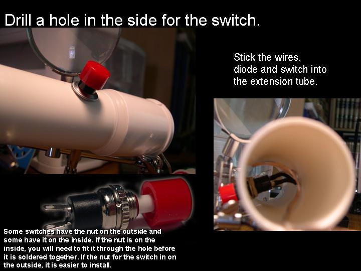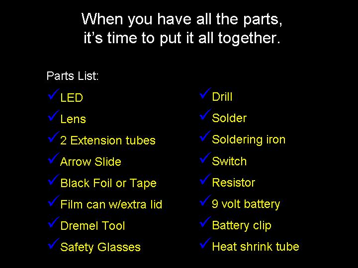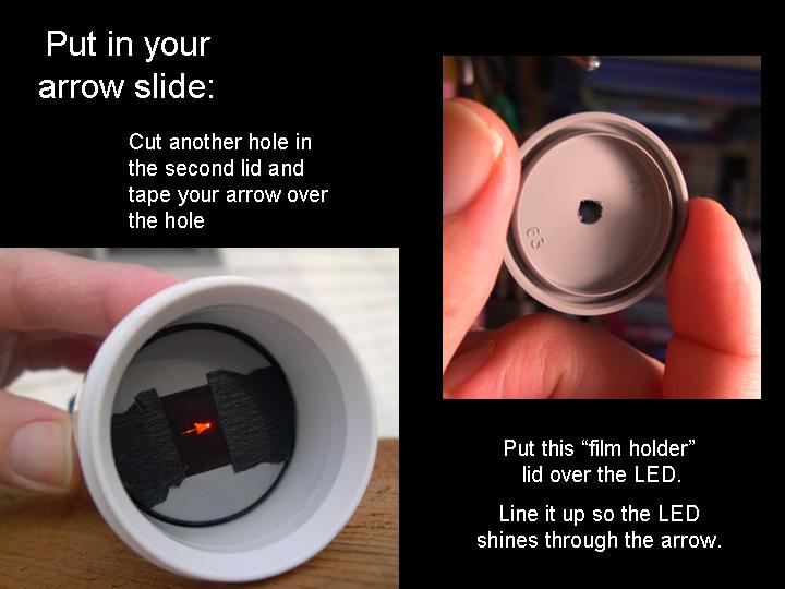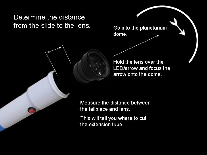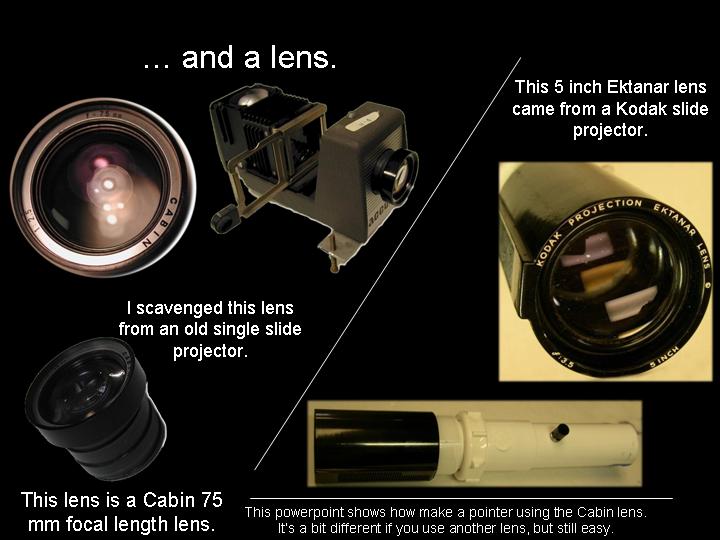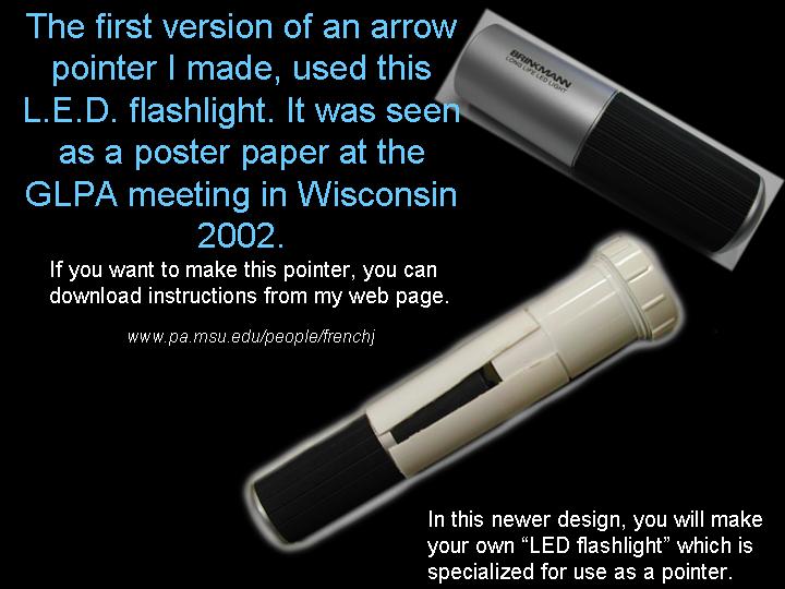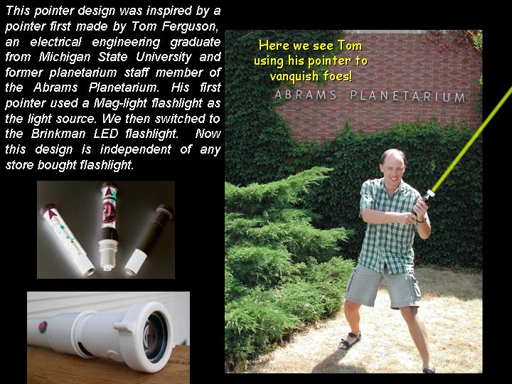 Abstract: The first version of an arrow pointer I made, used a Brinkman L.E.D. flashlight. It was seen as a poster paper at the GLPA meeting in Wisconsin 2002. One problem with it was the availability of the flashlight. It was only sold at Wal-mart and there's no tellin' how long Brinkman will keep making them . Also the switch was located on the bottom of the flashlight. To overcome the drawbacks of the first design, I came up a new LED arrow pointer. These instructions are for a pointer that does not use a store bought flashlight. It uses a superbright LED. The switch can be placed on the side where it feels more natural and can be used with one hand. Although I do recommend holding any pointer with both hands just to make it steadier. The first thing you will need is a "Superbright" Light Emitting Diode. There are several places to buy them. Most electronics parts supply stores sell them. Another option is to buy a keychain flashlight and remove its LED. I bought mine over the internet. A place called superbrightleds.com has a large selection, low prices and fast shipping. Red and yellow LED's were 62¢ and the white LED cost $1.59 each. The brightness or intensity of LED's are measured in millicandela (mcd). Get one rated over 10,000 mcd. Superbright red ones are 12,000 mcd. Superbright yellows are 10,000 mcd . Superbright whites are 18,000 mcd. The lens is the next item. I have had success with lenses from old single slide projectors. I found a Cabin 75mm focal length lens that works nice. Many of you might have some of these old projectors in your surplus closet. I've also used a 5-inch Ektanar lens from a Kodak carrousel slide projector. The 5 inch lens projects a smaller image than the 75mm lens. The body of the pointer and the lens holder is made from plastic plumbing parts. Get two, 6 inch long, 1½ inch extension tubes. These are also known as tailpieces. It's the part of your bathroom sink, just under the drain, before the P trap. They cost about $2.00 each. From your local electronics store, get a push button switch, a resistor, some heat shrink tubing, and solder. For the switch. You can get a momentary-on switch or an on/off switch. A momentary-on switch will be "on" when you push the button and "off" when you let go. Don't get a momentary-off switch unless you want it to be on all the time and off when you push the button! Also watch where the nut is for the push button switch. Some switches have the nut on the outside and some have it on the inside. If the nut is on the inside, you will need to fit it through the hole before it is soldered together. If the nut for the switch in on the outside, it will be easier to install. The resistor is key. You need to get one that limits the current through the LED. Light Emitting Diodes typically shine brightest at 20 milliamps of current. More current than 20 mA can burn out the diode or shorten its lifetime. At less current, it won't be as bright. A resistor costs just a few cents. However, they are usually bought in multipacks. Radio Shack sells a pack with a variety of resistor values for just a few dollars. To determine how many ohms your resistor needs to be, use a multimeter. Set the multimeter to measure milliamps and measure the current as you try different resistors. Try and get as close to 20 mA without going over. If you don't have a meter, there are calculators available on the web that let you input your voltage and current and output the correct resistance. Or you can just go with 330 ohms for most LED's when using a 9 volt battery. LED's do vary a bit though, so this isn't going to be exact for every diode. Next, make an arrow. I made my arrow using PaintShop Pro which is a graphics program like Photoshop. Then I sent it out to Gamma Tech to have it made into a slide. You can make any type of arrow or download one that I made from my web page. It's important to make sure that your arrow on the slide is about the size of the LED. So it does have to be quite small on the film chip. The arrow I used is only about 3.5 mm from tip to tail. The diode is going to be mounted inside the lid of a 35mm film can. Before the days of digital cameras, everyone had these laying around in the darkroom. If you can't find one. Go to your local camera store and ask for some. They should give them to you for free. Most places just throw them away. I picked up a bag full at my local CVS drug store in the film developing section. Get the black with grey caps. Not the clear ones. Once you have all the parts, start putting it together. Make the circuit first. Solder the resistor in series with the LED. Solder in the switch and the battery snap. Be sure to get the LED in the right way. LED's have a positive and negative lead. If it's in wrong, it won't work. Also be careful when soldering the LED. It can be damaged by the heat of the soldering iron. Use a heat sink to protect it. When the circuit is done, put the LED through a little hole in the top of the film can lid. Cut out a notch for the switch in the side of the can. Drill a hole for the switch in the tailpiece. Stick the circuit in the tailpiece. Clip on a 9 volt battery and see if it lights up. Take another film can lid, cut a hole in it and tape your arrow slide to the second lid. Place it directly over the light emitting diode. Now, work on the lens holder. This will be a bit different for each lens. For the Cabin lens, I had to ream out the inside of the second tailpiece with a Dremel tool to make it fit. For the Kodak lens, I trimmed the outside of the tailpiece and slipped it over the top. I used a small piece of plastic from a film can as a shim to make a tighter fit. Cut the tailpiece to the proper length. Take your almost finished pointer into the planetarium dome and hold the lens over the arrow and get an idea how far above the arrow, the lens has to be. Cut the tailpiece to that you have some room to slide the lens up and down in the body of the first tailpiece. Put some b