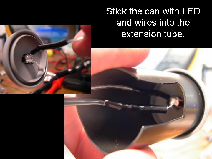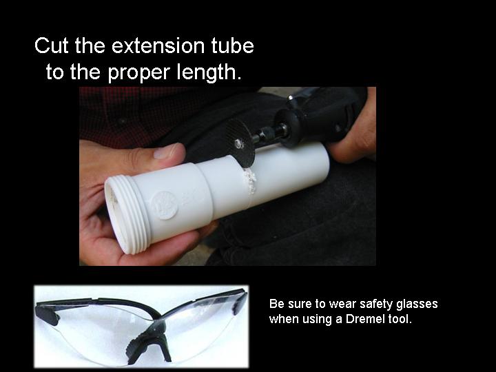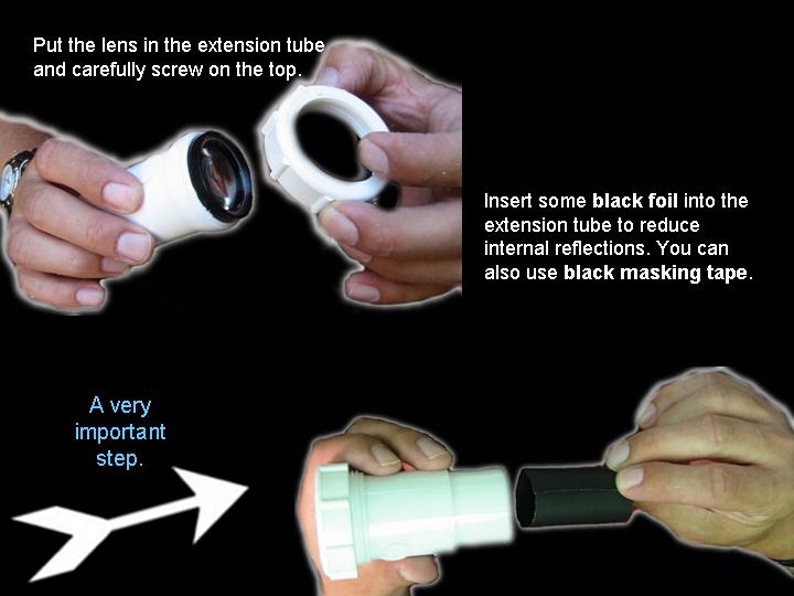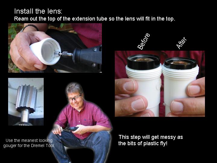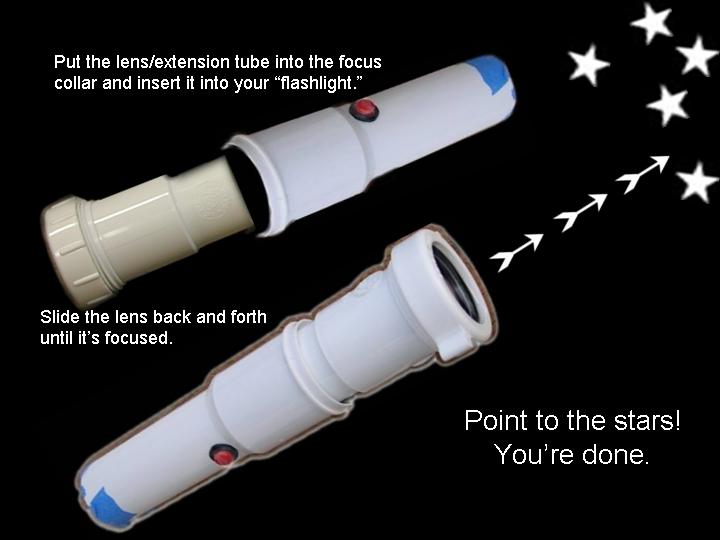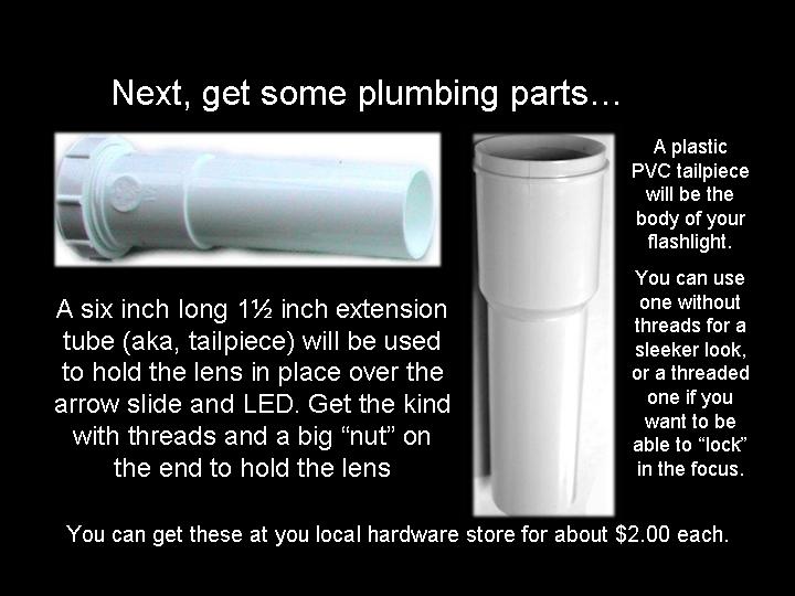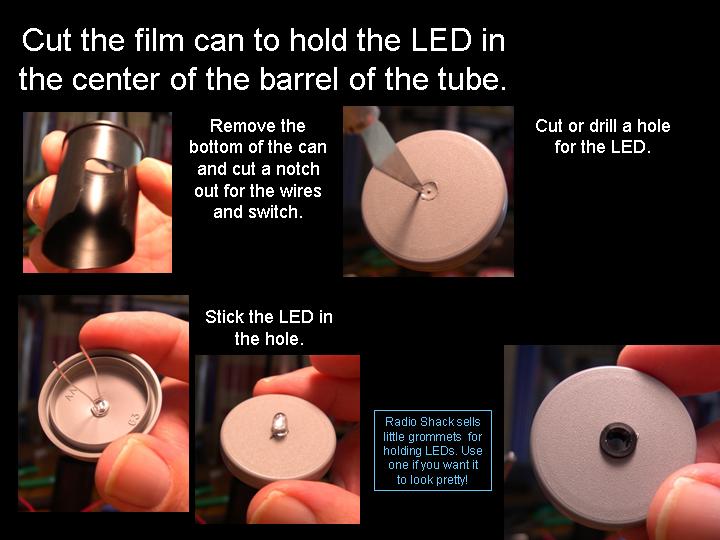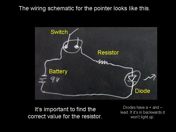 Abstract: The first version of an arrow pointer I made, used a Brinkman L.E.D. flashlight. It was seen as a poster paper at the GLPA meeting in Wisconsin 2002. One problem with it was the availability of the flashlight. It was only sold at Wal-mart and there's no tellin' how long Brinkman will keep making them . Also the switch was located on the bottom of the flashlight. To overcome the drawbacks of the first design, I came up a new LED arrow pointer. These instructions are for a pointer that does not use a store bought flashlight. It uses a superbright LED. The switch can be placed on the side where it feels more natural and can be used with one hand. Although I do recommend holding any pointer with both hands just to make it steadier. The first thing you will need is a "Superbright" Light Emitting Diode. There are several places to buy them. Most electronics parts supply stores sell them. Another option is to buy a keychain flashlight and remove its LED. I bought mine over the internet. A place called superbrightleds.com has a large selection, low prices and fast shipping. Red and yellow LED's were 62¢ and the white LED cost $1.59 each. The brightness or intensity of LED's are measured in millicandela (mcd). Get one rated over 10,000 mcd. Superbright red ones are 12,000 mcd. Superbright yellows are 10,000 mcd . Superbright whites are 18,000 mcd. The lens is the next item. I have had success with lenses from old single slide projectors. I found a Cabin 75mm focal length lens that works nice. Many of you might have some of these old projectors in your surplus closet. I've also used a 5-inch Ektanar lens from a Kodak carrousel slide projector. The 5 inch lens projects a smaller image than the 75mm lens. The body of the pointer and the lens holder is made from plastic plumbing parts. Get two, 6 inch long, 1½ inch extension tubes. These are also known as tailpieces. It's the part of your bathroom sink, just under the drain, before the P trap. They cost about $2.00 each. From your local electronics store, get a push button switch, a resistor, some heat shrink tubing, and solder. For the switch. You can get a momentary-on switch or an on/off switch. A momentary-on switch will be "on" when you push the button and "off" when you let go. Don't get a momentary-off switch unless you want it to be on all the time and off when you push the button! Also watch where the nut is for the push button switch. Some switches have the nut on the outside and some have it on the inside. If the nut is on the inside, you will need to fit it through the hole before it is soldered together. If the nut for the switch in on the outside, it will be easier to install. The resistor is key. You need to get one that limits the current through the LED. Light Emitting Diodes typically shine brightest at 20 milliamps of current. More current than 20 mA can burn out the diode or shorten its lifetime. At less current, it won't be as bright. A resistor costs just a few cents. However, they are usually bought in multipacks. Radio Shack sells a pack with a variety of resistor values for just a few dollars. To determine how many ohms your resistor needs to be, use a multimeter. Set the multimeter to measure milliamps and measure the current as you try different resistors. Try and get as close to 20 mA without going over. If you don't have a meter, there are calculators available on the web that let you input your voltage and current and output the correct resistance. Or you can just go with 330 ohms for most LED's when using a 9 volt battery. LED's do vary a bit though, so this isn't going to be exact for every diode. Next, make an arrow. I made my arrow using PaintShop Pro which is a graphics program like Photoshop. Then I sent it out to Gamma Tech to have it made into a slide. You can make any type of arrow or download one that I made from my web page. It's important to make sure that your arrow on the slide is about the size of the LED. So it does have to be quite small on the film chip. The arrow I used is only about 3.5 mm from tip to tail. The diode is going to be mounted inside the lid of a 35mm film can. Before the days of digital cameras, everyone had these laying around in the darkroom. If you can't find one. Go to your local camera store and ask for some. They should give them to you for free. Most places just throw them away. I picked up a bag full at my local CVS drug store in the film developing section. Get the black with grey caps. Not the clear ones. Once you have all the parts, start putting it together. Make the circuit first. Solder the resistor in series with the LED. Solder in the switch and the battery snap. Be sure to get the LED in the right way. LED's have a positive and negative lead. If it's in wrong, it won't work. Also be careful when soldering the LED. It can be damaged by the heat of the soldering iron. Use a heat sink to protect it. When the circuit is done, put the LED through a little hole in the top of the film can lid. Cut out a notch for the switch in the side of the can. Drill a hole for the switch in the tailpiece. Stick the circuit in the tailpiece. Clip on a 9 volt battery and see if it lights up. Take another film can lid, cut a hole in it and tape your arrow slide to the second lid. Place it directly over the light emitting diode. Now, work on the lens holder. This will be a bit different for each lens. For the Cabin lens, I had to ream out the inside of the second tailpiece with a Dremel tool to make it fit. For the Kodak lens, I trimmed the outside of the tailpiece and slipped it over the top. I used a small piece of plastic from a film can as a shim to make a tighter fit. Cut the tailpiece to the proper length. Take your almost finished pointer into the planetarium dome and hold the lens over the arrow and get an idea how far above the arrow, the lens has to be. Cut the tailpiece to that you have some room to slide the lens up and down in the body of the first tailpiece. Put some b