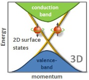 | Topological insulators, on the other hand, embody a new state of quantum matter intimately connected to a surface or edge. Every material, and the vacuum itself, can be characterized by a topological invariant which takes an interger value. If the value changes across an interface with another material or (with the vacuum) a conducting state forms at the boundary or edge for which spin and momentum are locked together. This is very unusual for a conducting state. For example the conduction electrons in a typical metal can travel in any direction regardless of their spin. Three-dimensional TIs such as Bi2Se3 host such topologically-protected conducting states on their surfaces. When a superconductor is placed in contact with the surface, the interplay among the topology, single-particle electron spin, and the superconductor condensate symmetry leads to incredibly rich physics. The superconductivity induced into the TI is predicted to emulate p-wave pairing symmetry which allows the formation of Majorana fermion (MF) bound states. |